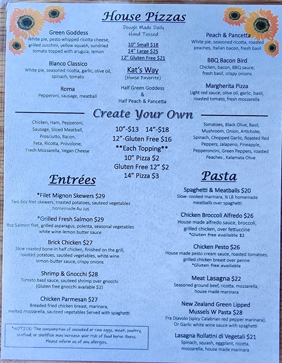 White pie, pesto whipped ricotta cheese, grilled zucchini, yellow squash, sundried tomato topped with arugula and lemon