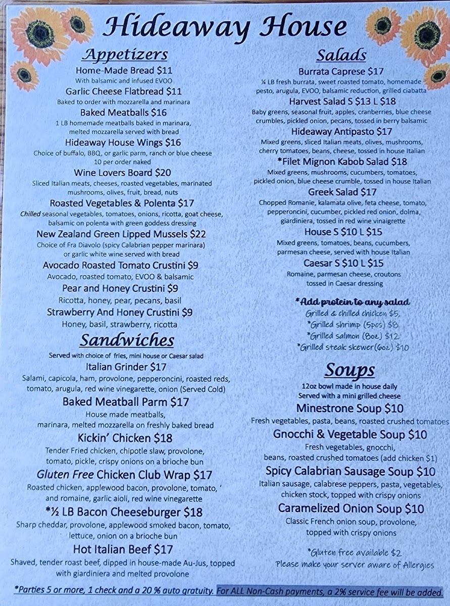 roasted chicken stock, fresh vegetables, gnocchi, beans, and crushed tomatoes. Gluten Free available. Add chicken for $1.